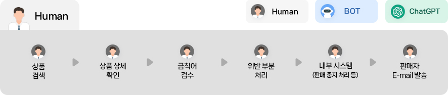 - 이슈를 해결을 위해 담당자는 일일이 등록된 상품 정보에서 금칙어(금지어)를 사용한 상품들을 찾아 판매 중지 및 비노출 처리하고 있었습니다.